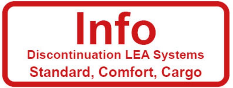 LiftEquip GmbH would like to inform you that the production of the LEA Standard 100/200, LEA Comfort 300/300 Plus and LEA Cargo systems will be shut down in the next few months and the product will be removed from our product range within the next year.