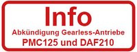 möchte die LiftEquip GmbH Sie darüber informieren, dass die Produktion der Gearless-Antriebe PMC125 und DAF210 in den nächsten Monaten heruntergefahren wird und die Produkte innerhalb des nächsten Jahres aus unserem Produktangebot entfernt werden.