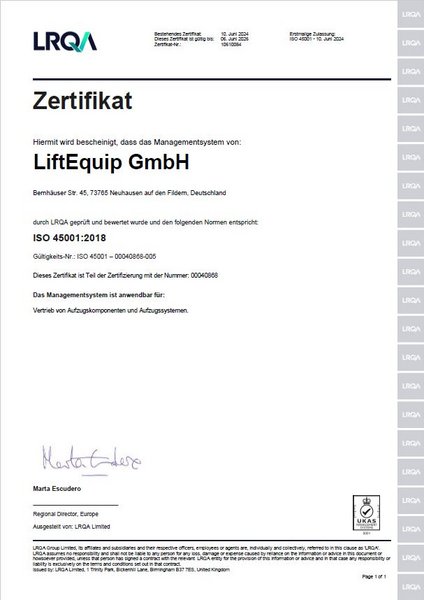 Für den Geltungsbereich Vertrieb von Aufzugskomponenten und Aufzugssystemen wird ein Arbeits- und Gesundheitsschutzmanagementsystem angewendet.