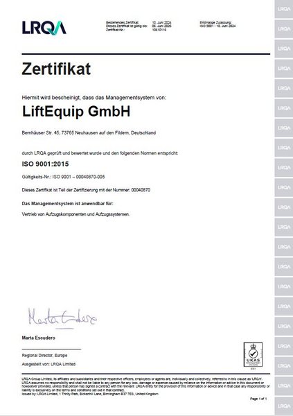 Für den Geltungsbereich Vertrieb von Aufzugskomponenten und Aufzugssystemen wird ein Qualitätsmanagementsystem angewendet.